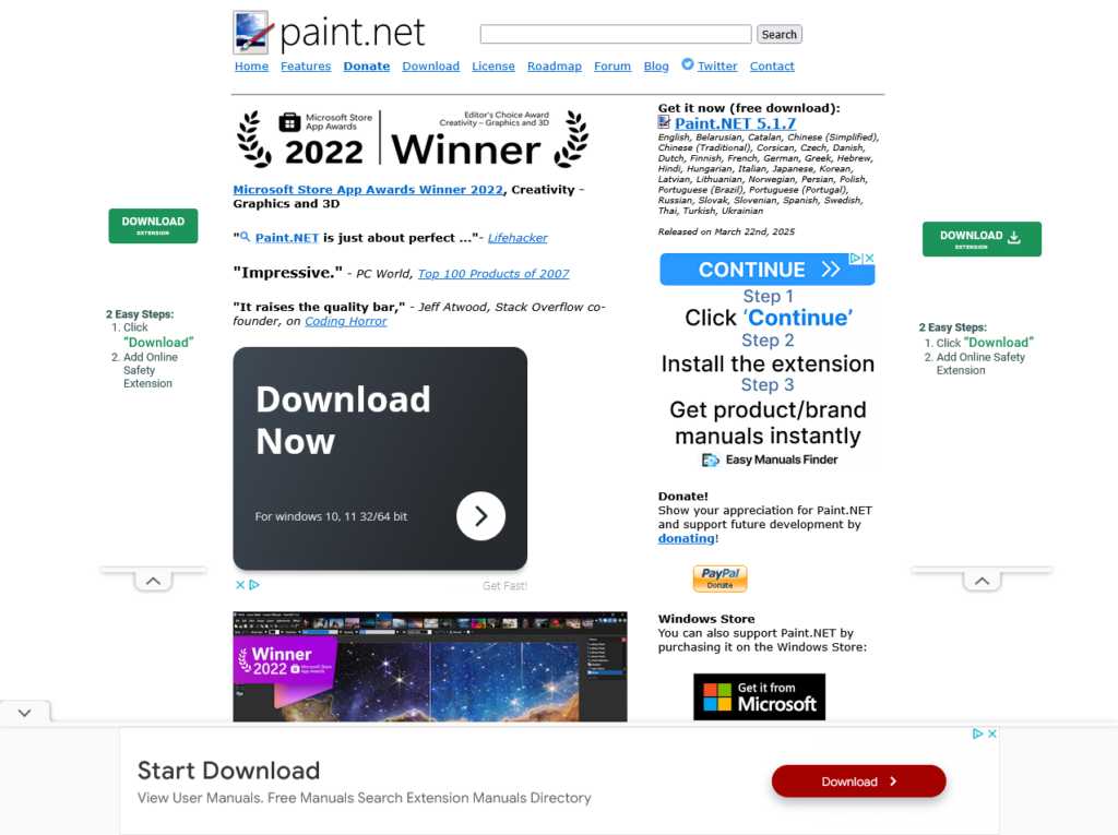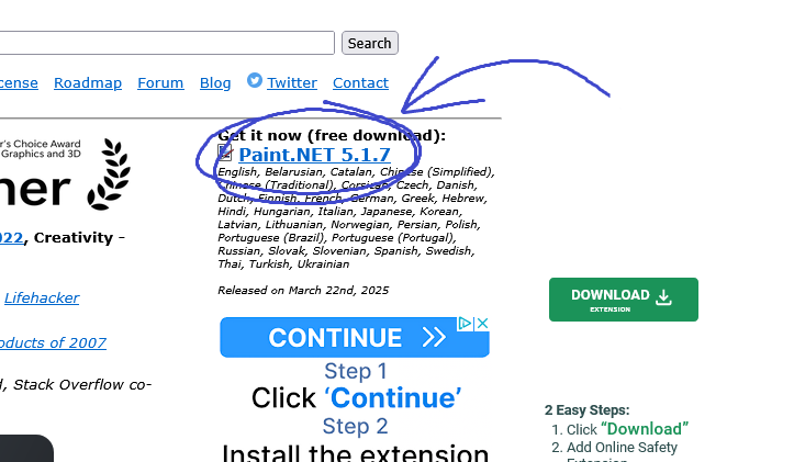 No. Each and every one of these malicious download buttons you see above originate from Google’s Ad Network. Paint.net runs ads on their website to generate revenue, as the software is provided free of charge. It’s not their fault for this deception; the finger lies on Google. In 2025, Google’s still not able to stop them, despite having some of the best image-identification tech around.
