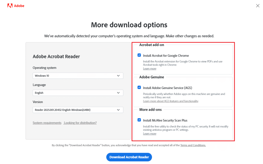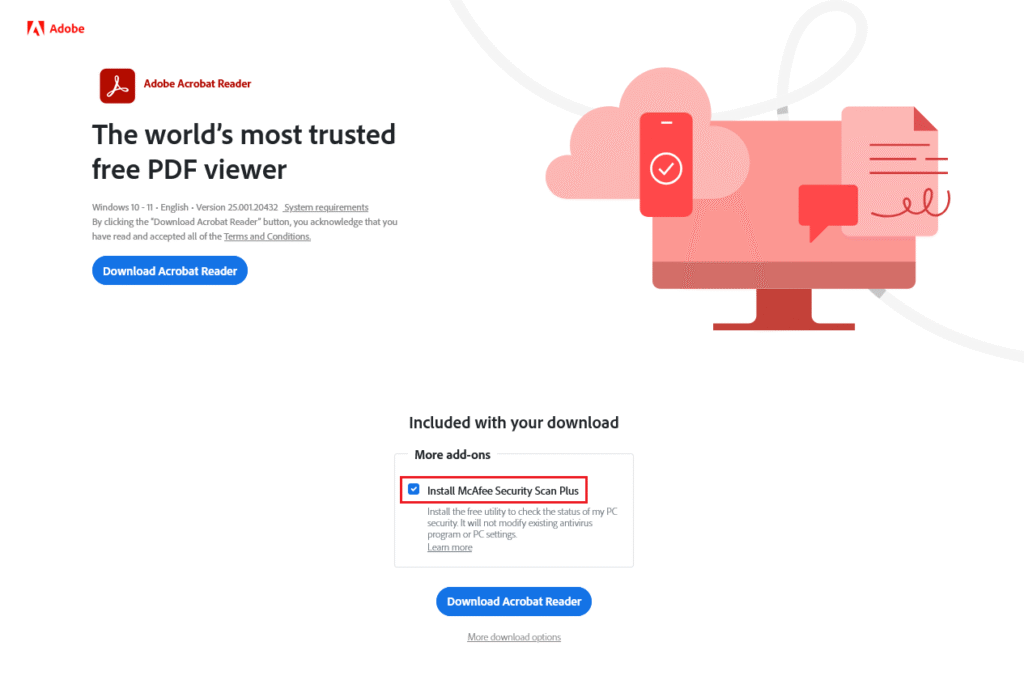 Note: I’ve expanded this image so that you can see the full thing. This is the official Adobe PDF website, and McAfee security scan plus is checked by default, even though most people don’t want it. If you’re not being extra careful, you’ll be scratching your head a few minutes after the install. Look out for pre-checked boxes!