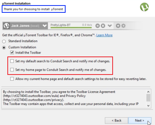 Here’s another example. You’re installing an app called uTorrent. If you’re not paying attention, the next time you search for something online, you’re default search provider will changed from Google to Conduit Search. Would you know how to change it back? Let’s uncheck those.
